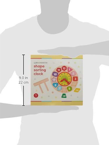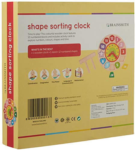 EDUCATIONAL WOODEN TOY FOR PRESCHOOL KIDS: The Brainsmith Shape Sorting Clock toy has 12 removable wooden shapes to teach children colours, numbers and to read a clock and time. It is a child-safe toy