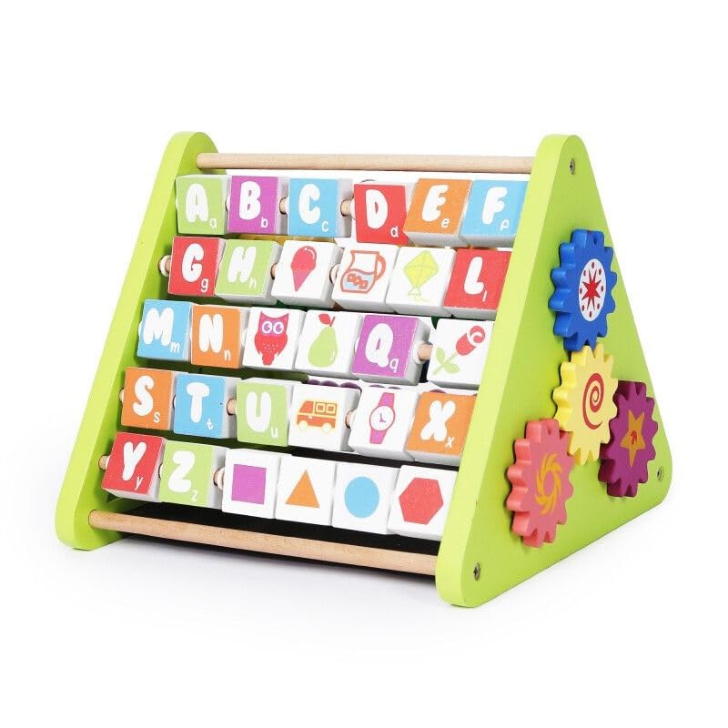 5-IN-1 MULTI ACTIVITY TRIANGLE STEM LEARNING TOY: This toy is a multifunctional wooden activity cube triangle that features a variety of activities. It includes 26 alphabet blocks and four number blocks with pictures and English words, an abacus, a clock, a zig zag sliding fish on four sides, and a white board at the bottom