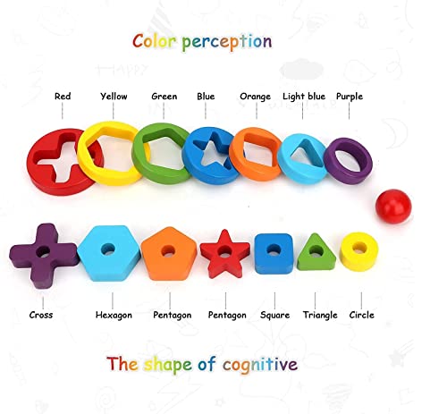 WAYS TO PLAY AND LEARN: Wooden toddler learning toys includes 7 colorful smooth rings, 7 different Geometric patterns inside and a solid wood base, with a red wooden ball on the top, set column play and shape matching gameplay are great for children to develop color and shape recognition