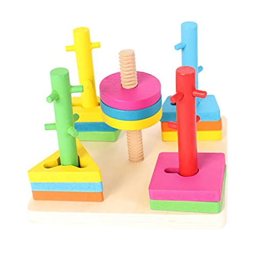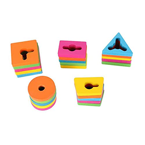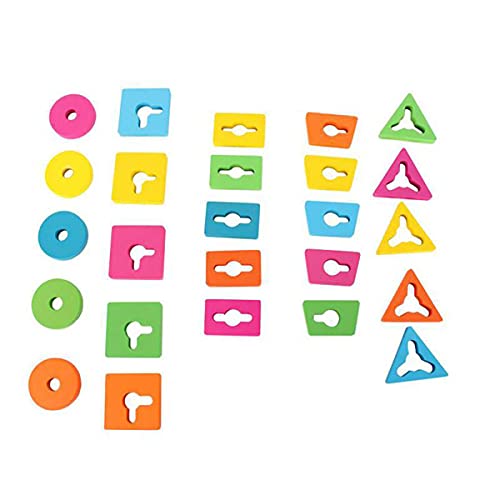 25 PACKS GEOMETRIC TOYS – Package includes 25 packs geometric blocks and a wooden base with 5 posts, 5 colors, 5 shapes rectangle/ square/ regular triangle/ circle/trapezium.