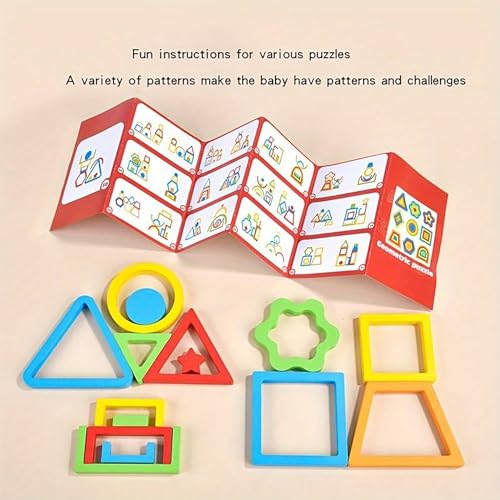 Unleash the boundless creativity and learning potential in your child with WISHKEY Geometric Puzzle Toy – the ultimate interactive game for young minds! This delightful package contains 9 wooden geometric shapes each divided into four pieces of different sizes. Therefore, in total, you will get 36 puzzle pieces and a catalogue having 50 unique designs to make and play. Crafted from quality wooden material with smooth round edges, safety is our priority. The non-toxic paint ensures your child’s well-being while they explore their imagination. Watch as your little ones joyfully pick a card, and with excitement in their eyes, recreate the design using the colorful puzzle pieces. Beyond its fun gameplay, this puzzle toy serves as an invaluable learning tool. Nurture essential skills like hand-eye coordination, color recognition, and motor skills while enhancing cognitive abilities and analytical thinking. Moreover, you’ll love being an active part of their growth as you engage in interactive parent-child playtime. Invest in a toy that entertains, educates, and brings loved ones closer together. Embrace the joy of learning and creativity with our Rainbow Puzzle Toy.