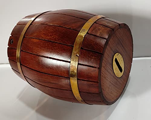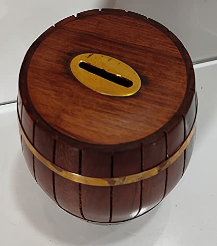 Wooden Money Piggy Bank Barrel with Brass Ring Design
